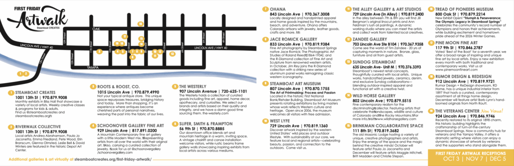 Free self-guided tour of local art galleries, museums and alternative venues in downtown Steamboat Springs.