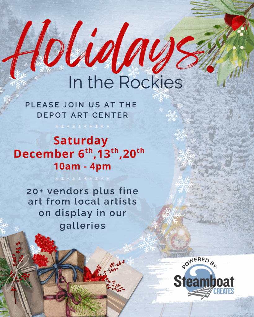 Join us at the Depot Art Center for Steamboat’s favorite holiday tradition! Holidays in the Rockies brings together local and regional artists, makers, and creatives for three festive Saturdays of shopping, art, and holiday cheer: December 6th, 13th, and 20th from 10 AM – 4 PM.